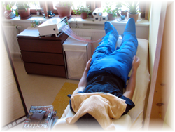 - Používám přístroj Lymfoven, který umožňuje kompresní lymfodrenáž. Přístroj pracuje s postupující tlakovou vlnou. Naplňováním jednotlivých komor speciálních návleku se v naprogramovaných intervalech vytváří zvolna postupující tlak, který účinně nahradí nefungující svalovou pumpu. Vznikají lehké, rytmické tlakové vlny. Běží od špičky chodidel nebo od kotníku přes lýtka, stehna a boky, pak tlak povoluje a opět začíná nová vlna. Již po první procedůře v délce zhruba 45 minut je dosahováno měřitelných výsledků. Existují značne individuální rozdíly, které závisí na věku a na stupni postižení vaziva. Břišní manžeta přispívá k rychlému snížení objemu pasu i u tzv. pivního břicha. Masáž břicha podporuje zažívání a pohyblivost střev. Přirozeným způsobem se tak aktivuje trávení. V tomto ohledu se výsledek dostavuje již po první procedůře.